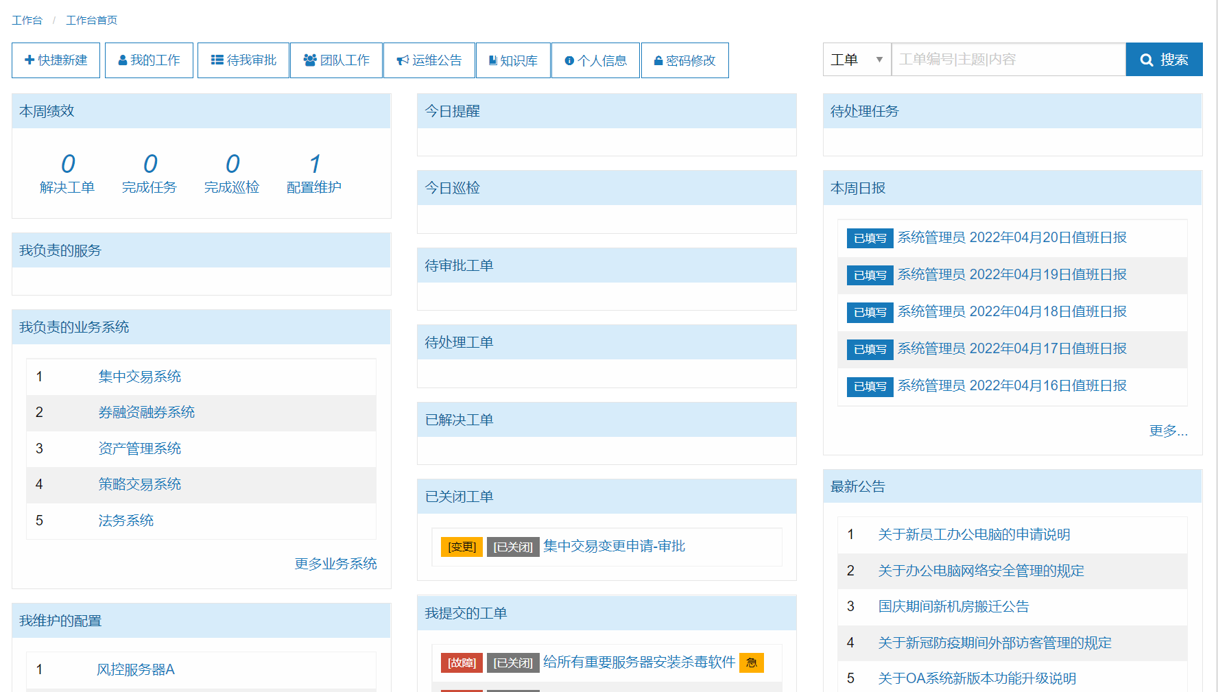 | 1 | 我的工作 | 工作臺中我的工作列表提供工程師參與處理的運維工作信息,包含工單、任務(wù)、項目、配置項等劃撥到工程師工作職責(zé)范圍內(nèi)的事項。 |